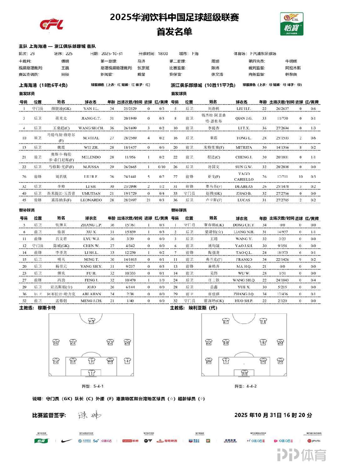 北京时间10月31日18:00,中超联赛第29轮,上海海港坐镇主场迎战浙江队,本场比赛主裁判是傅明,VAR是王巍,赛前双方公布首发: 上海海港首发:1-颜骏凌、4-王燊超、3-蒋光太、13-魏震、40-吾米提江、32-李帅、10-维塔尔、21-梅伦多、22-茹萨、26-刘若钒、45-莱昂纳多 替补:12-陈威、5-张琳芃、6-徐新、11-吕文君、14-李圣龙、15-明天、20-杨世元、23-傅欢、27-冯劲、29-亚历斯祖、36-阿布拉汗、52-孟敬朝 浙江队首发:33-赵博、16-童磊、5-刘浩帆、36-卢卡斯、26-孙国文、8-钱杰给、22-程进、10-李提香、20-米特里策、31-奥乌苏、27-亚戈 替补:1-董春雨、32-霍深坪、2-梁诺恒、3-王瑒、24-汪士钦、28-岳鑫、6-姚均晟、11-弗兰克、14-吴伟、29-张佳祺、7-陶强龙、13-麻皓齐 ![]() |